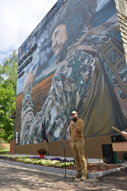 Відкриття меморіальної дошки Данилу Погорілову у Харкові. На тлі — стінопис на честь бійця, травень 2025 року. Харківська міська рада/Telegram