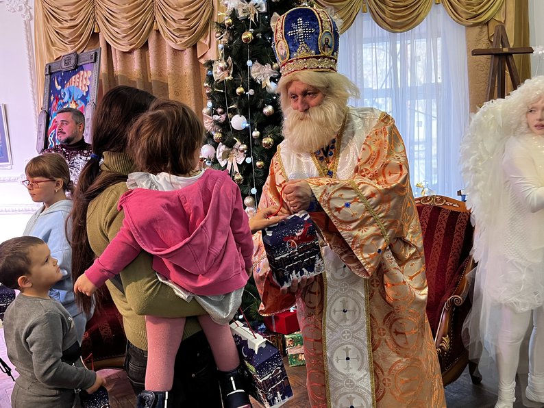 Святий Миколай дарує дитині подарунок. Фото: Єлизавета Кротик/Суспільне Миколаїв