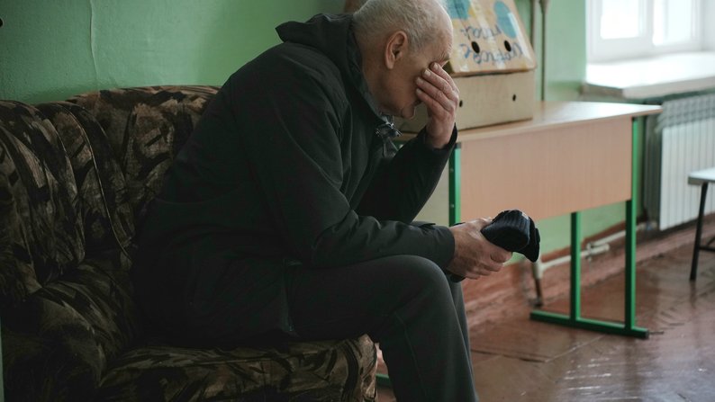 Чоловік, якого евакуювали, у Координаційному гуманітарному центрі. Суспільне Харків/Вікторія Якименко