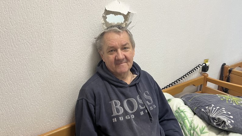 Микола Стріляний у палаті, яка зазнала пошкоджень через удар авіабомби РФ по території лікарні у Харкові, 14 жовтня 2025 року. Суспільне Харків/Дмитро Гребінник