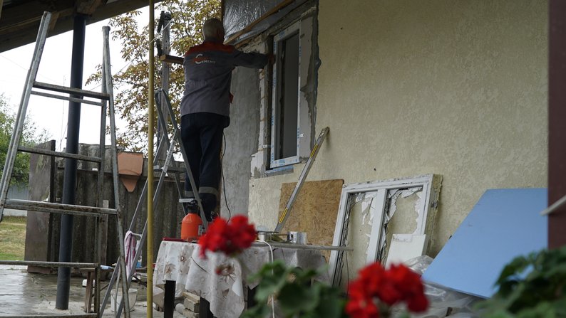 Олександр Чеснюк з селища Пришиб встановлює вікно, яке придбав на гроші з “єВідновлення”, Харківська область, вересень 2023 року. Олександр Ставицький/Суспільне Харків