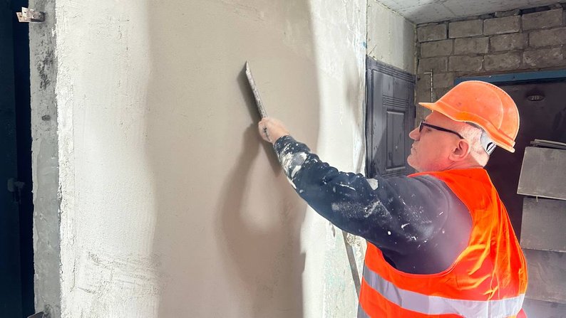 Ремонт у багатоповерхівці на вулиці Бучми в Харкові, яка була пошкоджена російськими обстрілами у 2022 році, жовтень 2025 року. Харківська міська рада