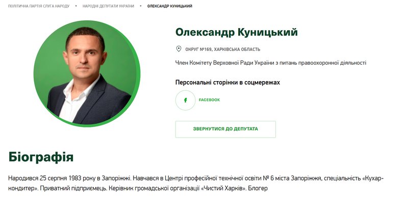 Звернутися до Олександра Куницького жителі округу №169 у Харкові потенційно можуть через сайт партії “Слуга народу”. Слуга народу