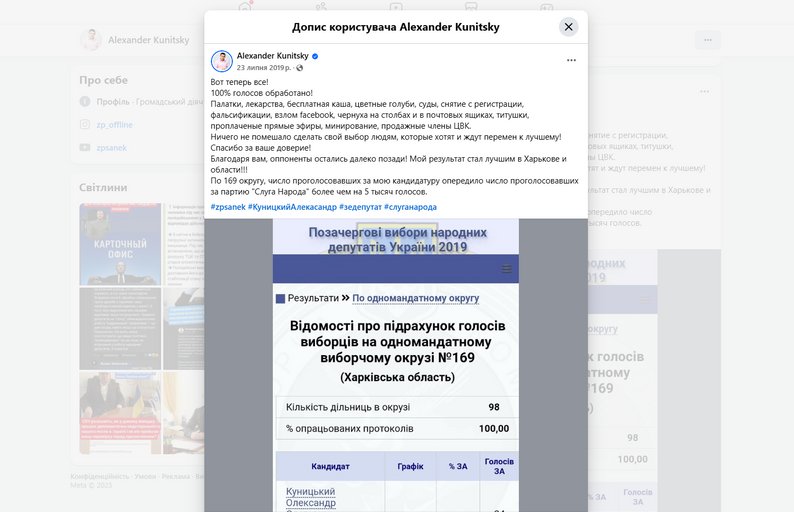 Пост Олександра Куницького у Facebook після перемоги на виборах. Олександр Куницький