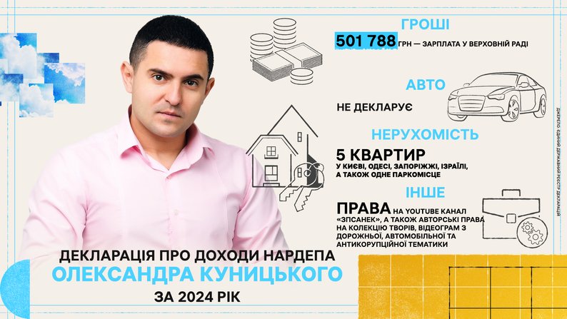 За 2024 рік він задекларував шість об’єктів нерухомості, які були вказані й в попередніх деклараціях. Єдиним джерелом доходу Куницького була зарплата у Верховній Раді — 501 788 грн. Готівкою він зберігав 115 тис. доларів, на банківському рахунку — 1780 доларів.