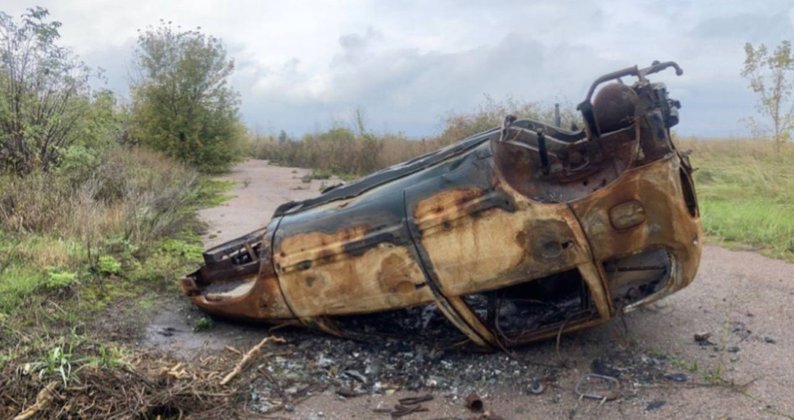 Авто, у якому згоріли тіла фермера та двох його працівників у Зеленому Гаю Куп’янського району в березні 2022 року. Харківська обласна прокуратура