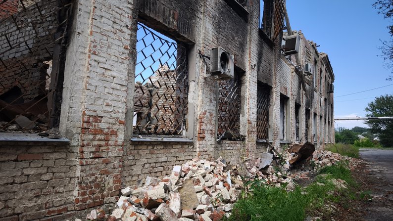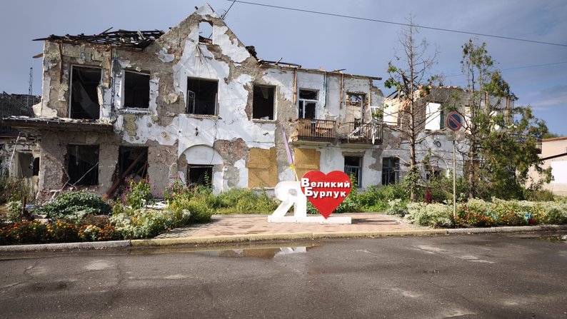 Пошкоджена будівля біля стели “Я люблю Великий Бурлук”, 10 вересня 2025 року. Суспільне Харків/Дар’я Нематіан золбін