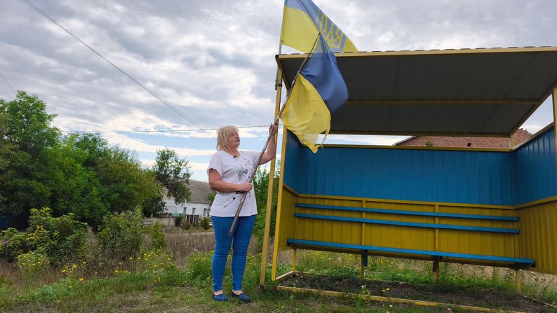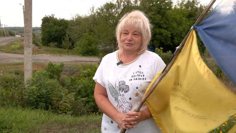 11 вересня 2022 року Надія вперше вийшла з саморобним прапором, коли українські військові заходили до селища. Суспільне Харків/Дар’я Нематіан золбін