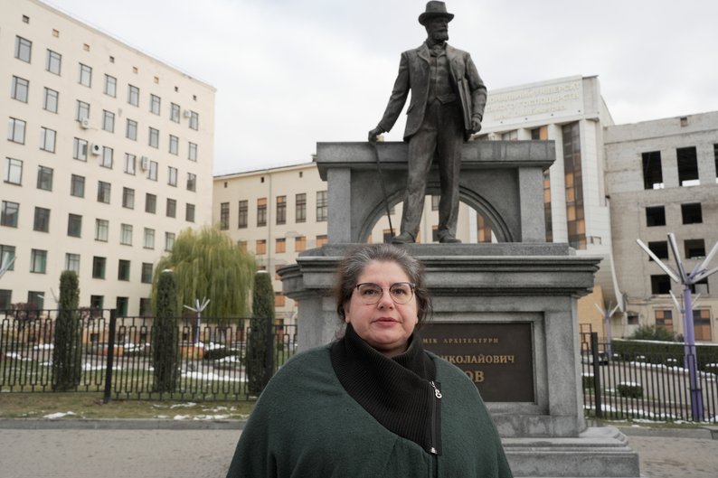 Олена Рофе-Бекетова поруч з пам’ятником Олексію Бекетову біля пошкодженого ударами РФ університету міського господарства ім. Бекетова. Суспільне Харків/Євген Гертнер