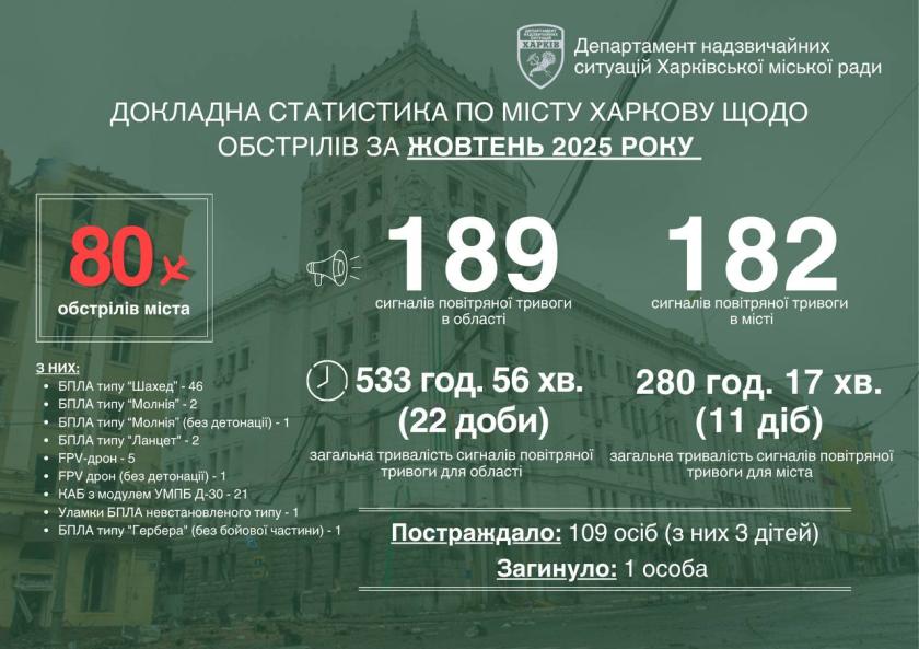 За місяць Росія завдала 80 ударів по місту. Постраждали 109 осіб, серед них – троє дітей. Таку статистику за жовтень оприлюднив Харківський міський голова Ігор Терехов.