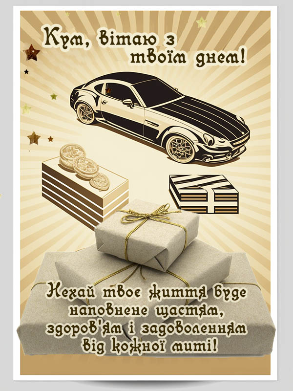 Дорогий куме, нехай твоє життя буде наповнене щастям, легкістю та успіхом! Нехай блиск у твоїх очах ніколи не гасне, заряджайся бадьорістю і крокуй до поставлених цілей! Нехай настрій завжди буде райдужним, кохання — міцним, а щастя — неземним!