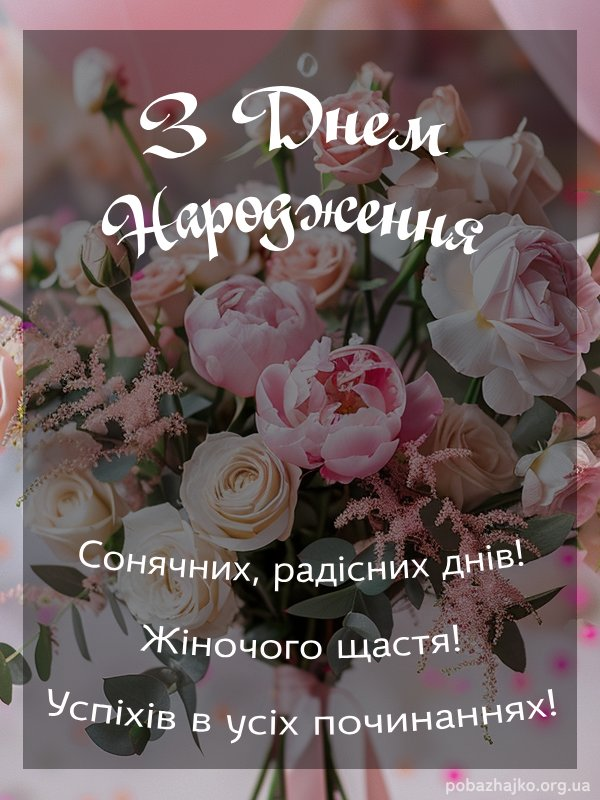З днем народження, прекрасна жінко! Бажаю, щоб кожна мить життя була наповнена радістю та задоволенням. Нехай у тебе завжди будуть щастя, здоров’я та успіх у всіх починаннях!