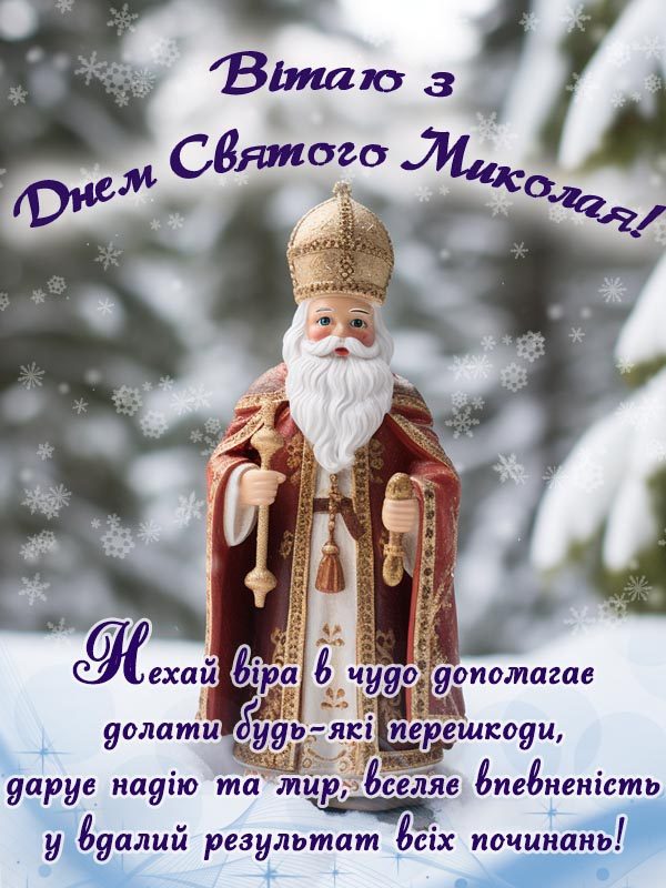 Зі святом вітаю і бажаю, щоб Миколай Чудотворець відгукувався на твої молитви й все в житті завжди складалося чудесним чином! Нехай віра в чудо допомагає долати будь-які перешкоди, дарує надію, вселяє впевненість в щасливий результат твоїх добрих починань!