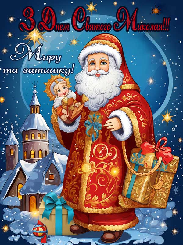 Прийміть мої щирі вітання з Днем святого Миколая! Бажаю миру, добра, сімейного затишку та всього найкращого! Нехай святий Миколай вбереже вас та ваших близьких від всіх бід та незгод, подарує любов, радість та справжню віру у дива! Хай збуваються всі ваші великі та маленькі мрії!
