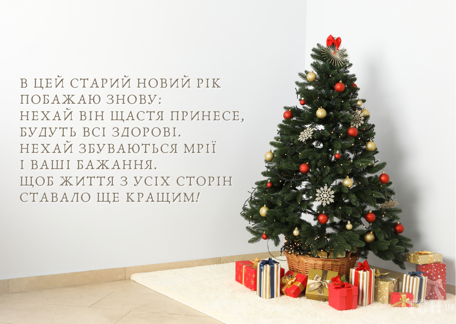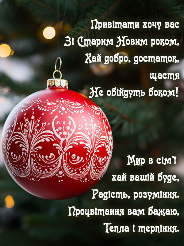 Вітаю зі Старим Новим роком! Бажаю позбавитись від усього старого та непотрібного, бажаю з нової сторінки розпочати цей рік. І нехай він буде добрим та вдалим. Бажаю сяяти від щастя, наче ялинка від гірлянд, бажаю, щоб святковий настрій у тебе був кожен день.