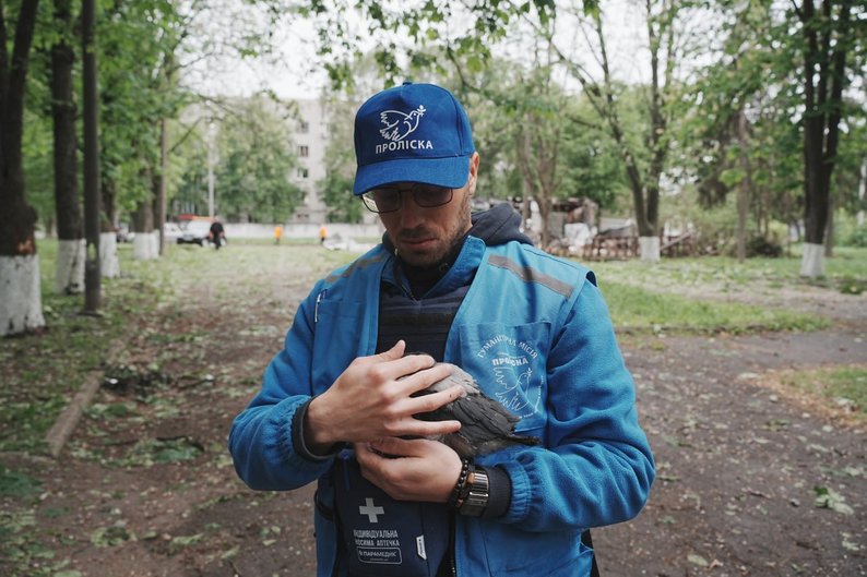 Працівник гуманітарної місії “Проліска” врятував пташеня сірої ворони після обстрілу Харкова, 6 травня 2025 року. Суспільне Харків/Вікторія Якименко