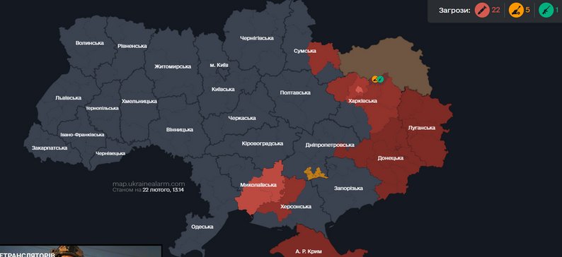 Карта повітряних тривог в Україні, 22 лютого 2026 року. Скриншот з офіційної карти повітряних тривог