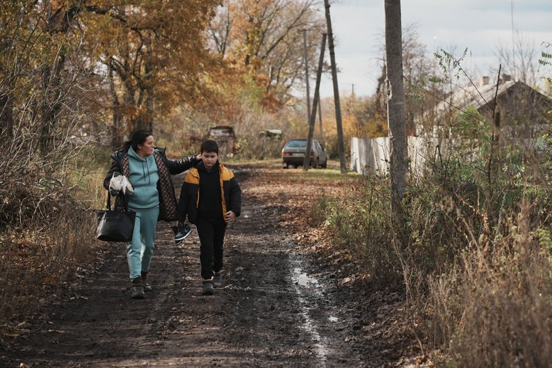 Світлана Пісьмєрова разом з 8-річним онуком Дем’яном йдуть вулицею, Куп’єваха, 30 жовтня 2025 року. Суспільне Харків/Вікторія Якименко