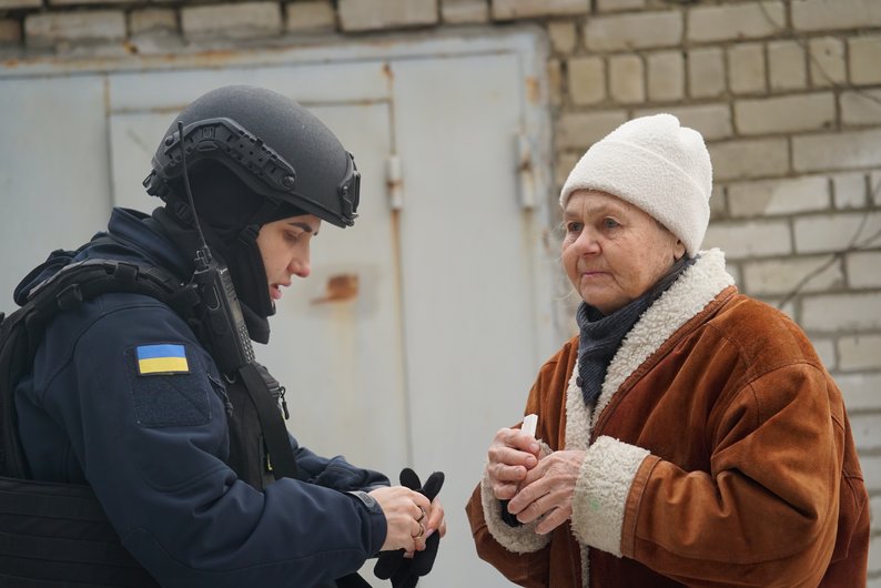 Поліцейська із жінкою біля місця влучання російського БпЛА у Шевченківському районі Харкова, 2 березня 2026 року. Суспільне Харків/Олександр Манченко