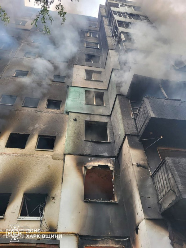 Росія завдала ударів БпЛА по житловій дев'ятиповерхівці у Куп'янську на Харківщині вдень 12 липня, внаслідок чого сталася пожежа.