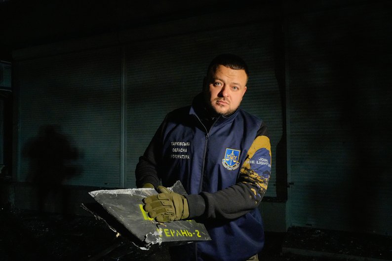 Речник облпрокуратури Дмитро Чубенко тримає у руках уламок російського безпілотника “Герань-2”, який впав на території Шевченківського району Харкова, 5 листопада 2024 року. Суспільне Харків/Євген Гертнер