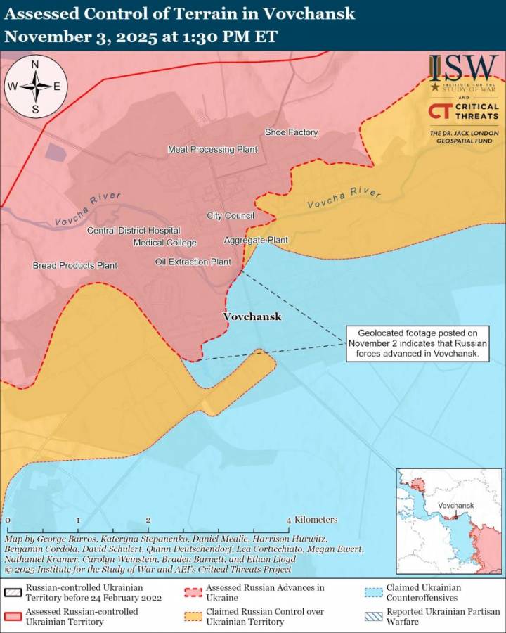 Після нетривалої перерви через підтоплення позицій на Вовчанському напрямку (сталось наприкінці жовтня після влучання українських безпілотників по дамбі Бєлгородського водосховища) окупанти знову відновили наступ у Вовчанську та на флангах. Армія РФ штурмує місто “в лоба”, тисне на західному фланзі, у напрямку села Синельникове та на східному, у Тихому та Вовчанських Хуторах.
