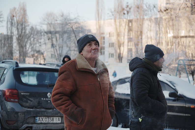 Чоловік біля місця влучання в Салтівському районі Харкова, 3 лютого 2026 року. Суспільне Харків/Вікторія Якименко