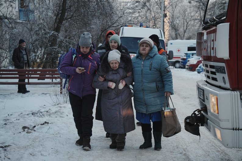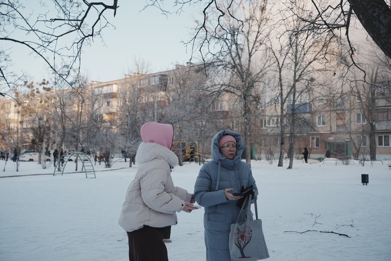 Жінки біля будинку, в який влучили росіяни в Салтівському районі Харкова, 3 лютого 2026 року. Суспільне Харків/Вікторія Якименко