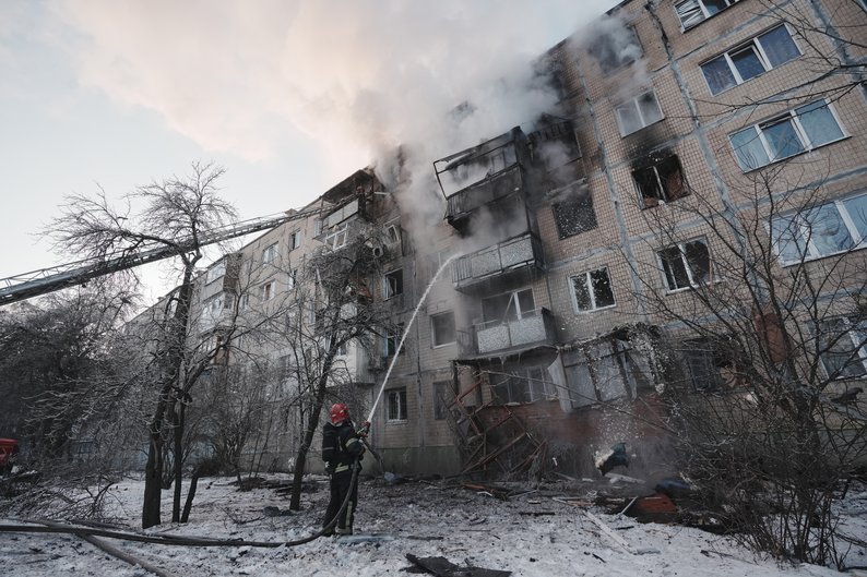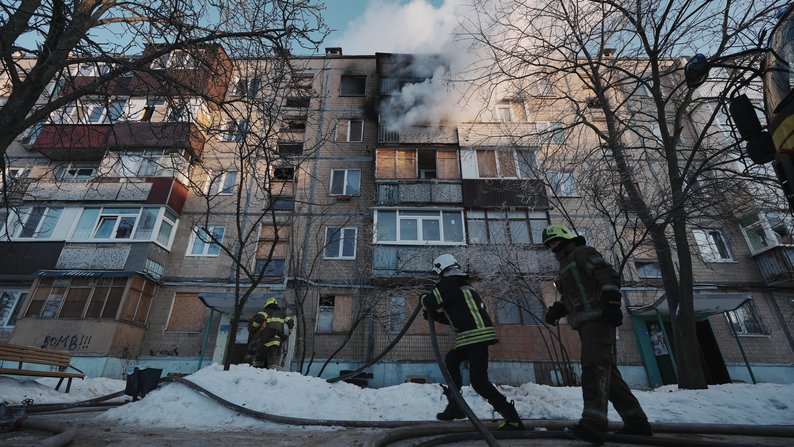 Рятувальник гасить пожежу в будинку, куди влучив російський БпЛА в Салтівському районі Харкова, 3 лютого 2026 року. Суспільне Харків/Вікторія Якименко