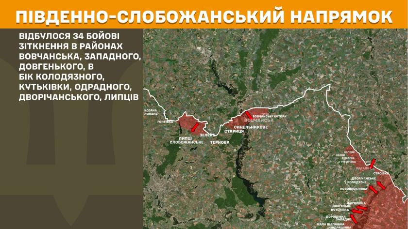“На Південно-Слобожанському напрямку відбулося 34 бойові зіткнення в районах Вовчанська, Западного, Довгенького, в бік Колодязного, Кутьківки, Одрадного, Дворічанського, Липців. На Куп’янському напрямку за добу зафіксовано сім атак окупантів. Сили оборони відбили штурмові дії противника в районах Куп’янська, Степової Новоселівки та в бік Курилівки”, — йдеться у зведенні Генштабу.