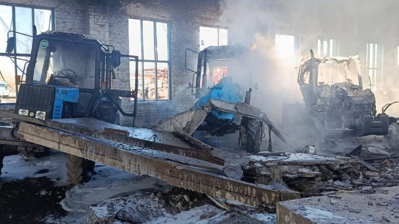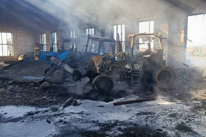 "Унаслідок удару пошкоджений дах ангара, один навантажувач та три трактори. На місці виникла пожежа", — сказано в повідомленні.