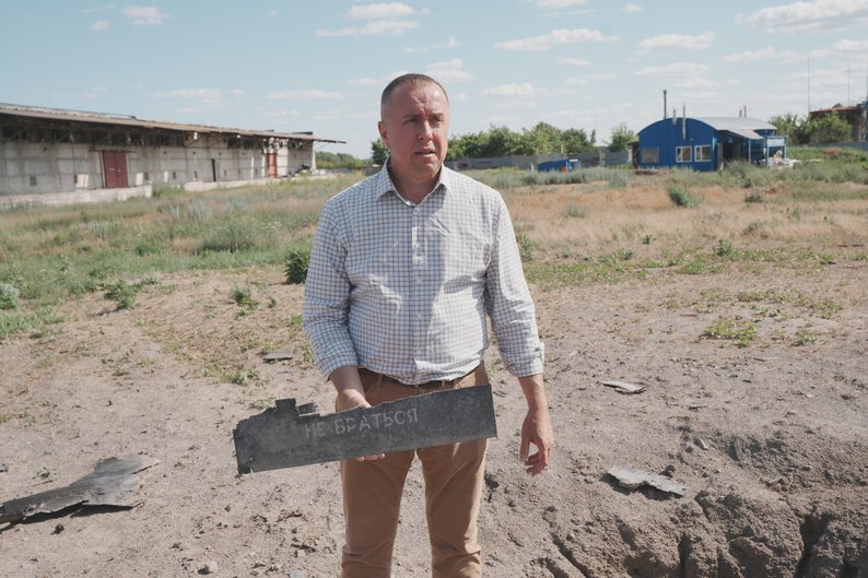 Директор підприємства Олександр Тимофєєв показує уламок дрона, яким атакували “Хімпром”. Суспільне Харків/Вікторія Якименко