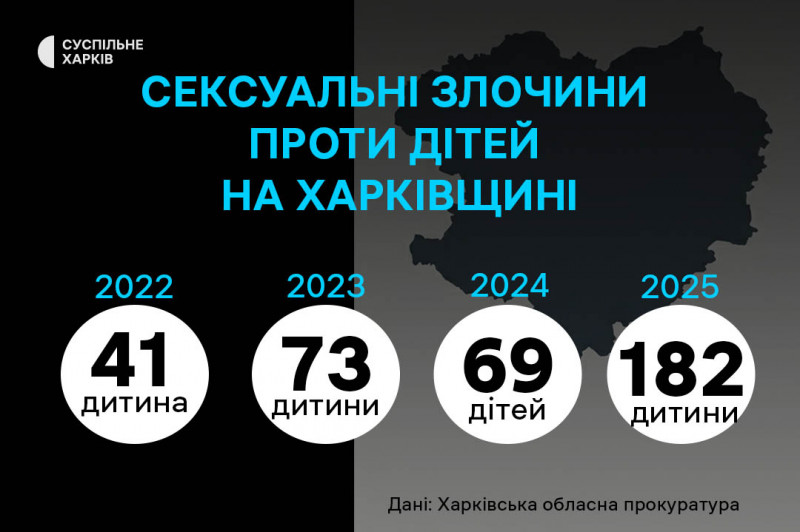 У Харківській області за останні чотири роки зросла кількість випадків, коли діти ставали жертвами сексуального насильства. Якщо у 2022 році потерпілими від таких злочинів визнали 41 дитину, то у 2025 році — 182 дітей.