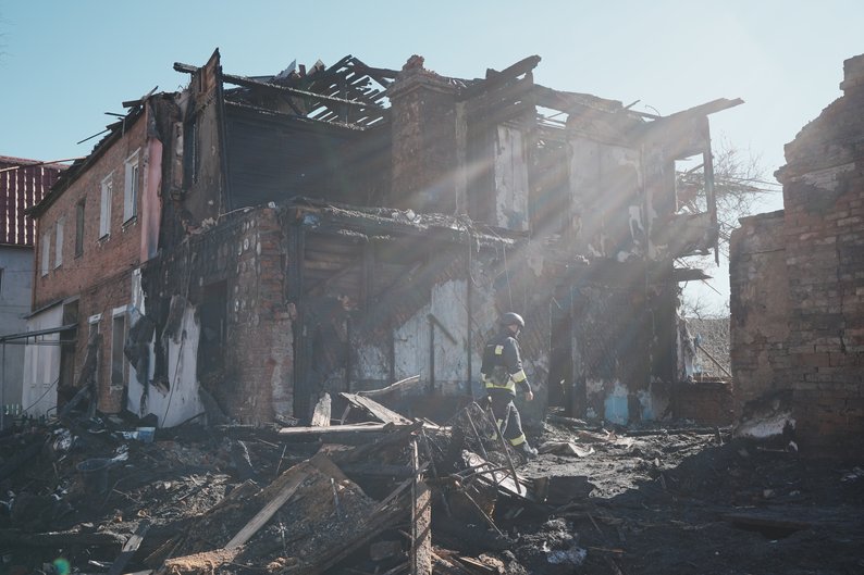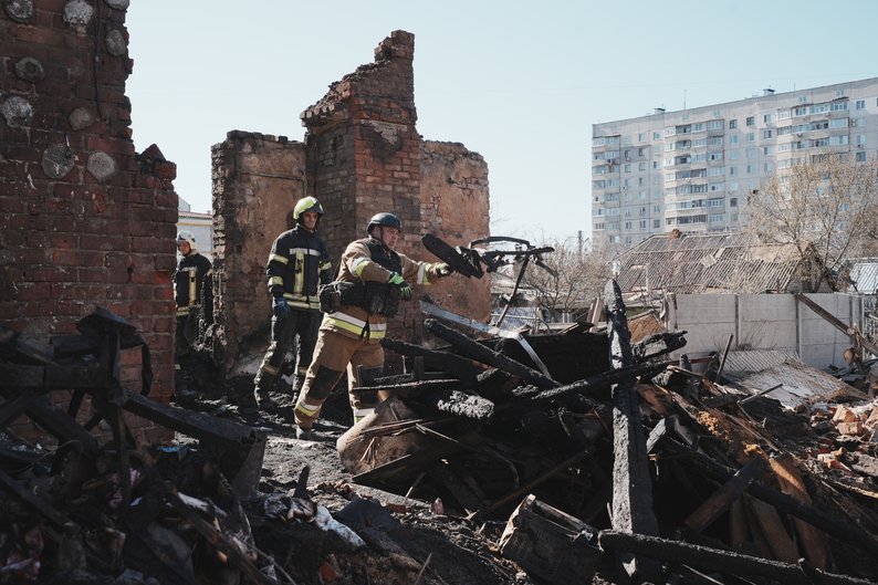 Рятувальники працюють на місці удару по Новобаварському району Харкова, 4 квітня 2025 року. Суспільне Харків/Вікторія Якименко