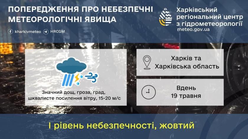Про це вранці 19 травня попередили в Регіональному центрі гідрометеорології.