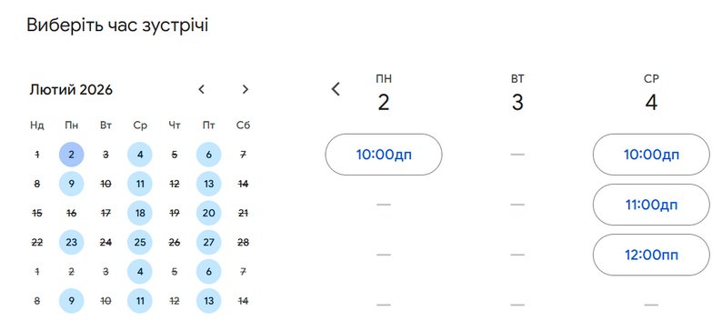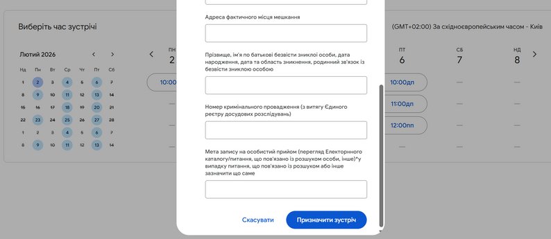 Календар запису на прийом у Спеціалізований центр з розшуку осіб, зниклих безвісти за особливих обставин, у Харкові на лютий 2026 року. Поліція Харківщини
