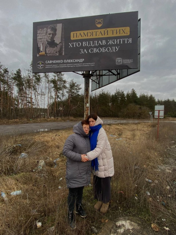 Марина з мамою біля банеру на трасі Харків – Ізюм. На той момент це було все, що вони мали, коли Олександр вважався пропавшим безвісти. Фото надала Марина