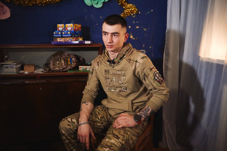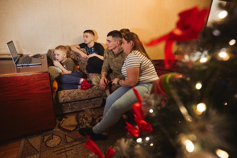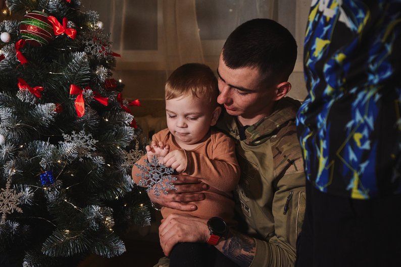 Військовослужбовець “Лютік” з родиною у Харкові, грудень 2025 року. Суспільне Харків/Вікторія ЯкименкоВдома із сім'єю спокійно. І я спокійний, і сім'я спокійна, що я вдома. А так ти не розумієш, що там відбувається, що може статися. Я вже звик, що на Новий рік може щось статися, а сім'я все одно переживає.