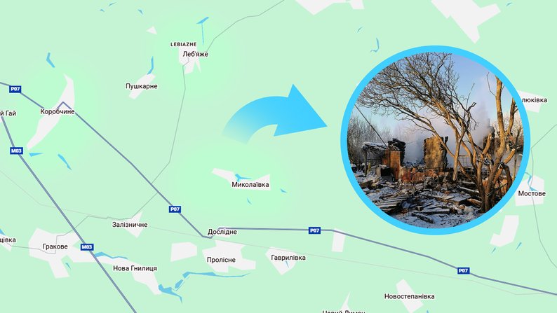 Наслідки ударів по Пролісненській громаді, січень 2026 року. Чкаловська СВА/FacebookУ Миколаївці близько 02:00 після влучання безпілотника у будинок зайнялася пожежа, яка перекинулася ще на одне помешкання. Бійці ДСНС загасили пожежу вже під ранок, але будинки згоріли майже зовсім. Від ударної хвилі у ближніх оселях повилітали вікна. У Леб'яжому у неділю, близько 10:00, безпілотник вдарив по домоволодінню, спричинивши суттєві пошкодження. Ближні помешкання також залишилися без вікон.
