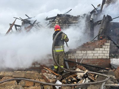 Рятувальник гасить пожежу, що зайнялася в триквартирному будинку у Великому Бурлуку після влучання безпілотника, Харківська область, 20 квітня 2026 року. ДСНС України