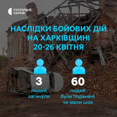 З 20 по 26 квітня на Харківщині внаслідок російських атак загинули троє людей, ще 60 звернулися по допомогу до медиків внаслідок поранень чи гострої реакції на стрес. Серед цих людей були евакуйовані жителі Куп'янська: вони були поранені 29 березня, але змогли отримати допомогу лікарів лише зараз.