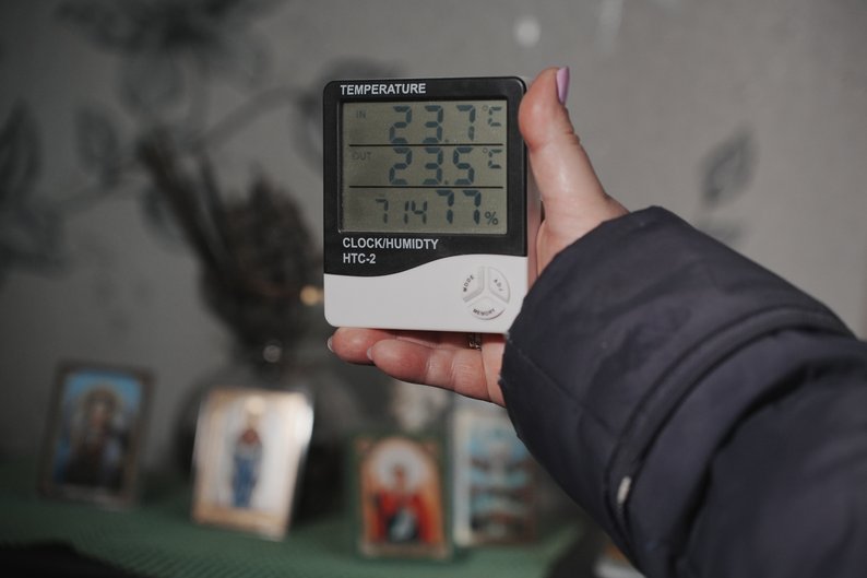 Жителька Північної Салтівки Світлана Орєхова показує на термометрі температуру в своїй квартирі, Харків, листопад 2025 року. Суспільне Харків/Вікторія Якименко