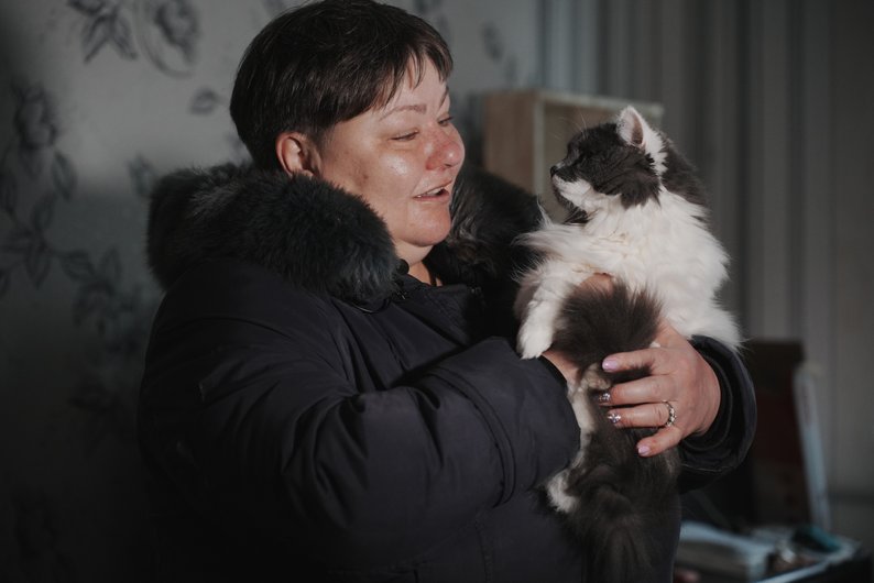 Жителька Північної Салтівки Світлана Орєхова з кішкою Маняшею в своїй квартирі, Харків, листопад 2025 року. Суспільне Харків/Вікторія Якименко
