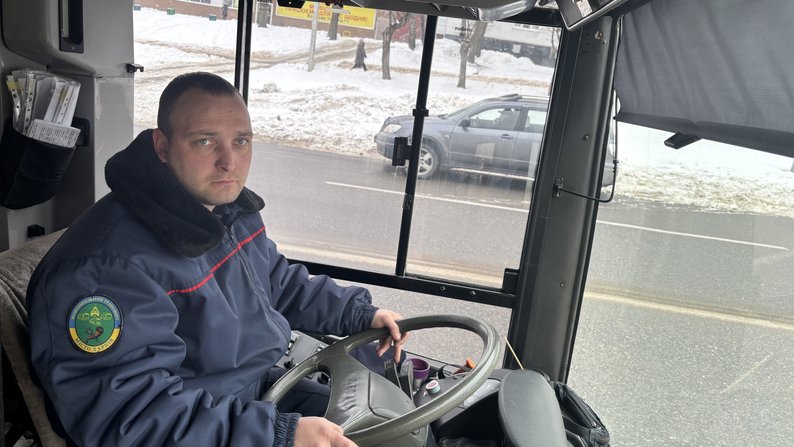 Водій 12-метрового автобуса Владислав. Суспільне Харків/Давид НадворнийКоли їду на роботу, для мене важливо те, щоб ходили — хоч тролейбуси, хоч автобуси. Щоб я знав, що у мене на зупинці, коли я прийшов, 35-ий автобус чи тролейбус був", — говорить пасажир Михайло Задорожній.