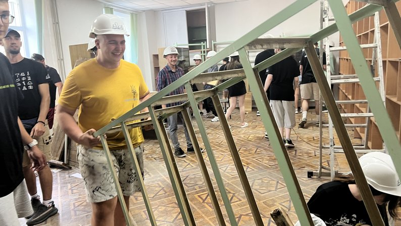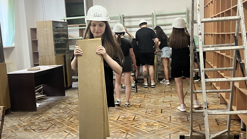 Молодь, яка допомагає відновити бібліотеку у Рогані на Харківщині. Суспільне Харків/Єлизавета Пшенична