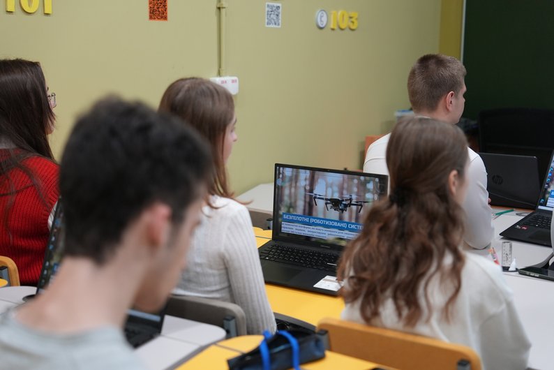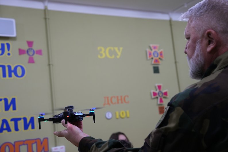 Вчитель “Захисту України” показує учням дрон. Суспільне Харків/Єлизавета Пшенична