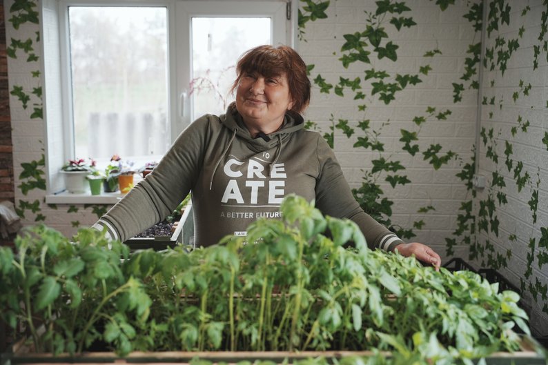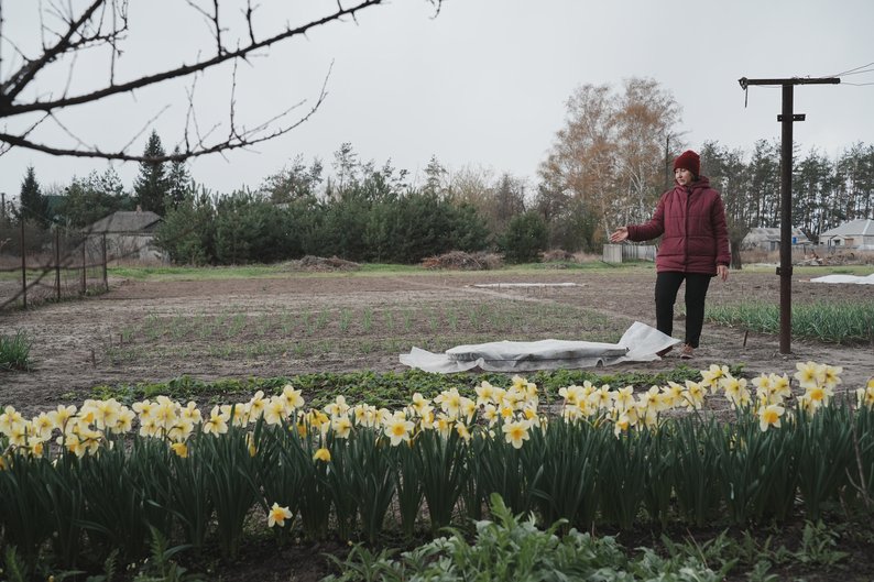 "Я, скільки тут живу, займаюся городництвом. Дуже полюбляю квіти. Вже тюльпани на підході ранні. Полуниця, яка з минулого року. Полуниця, посаджена на весні нещодавно, щоб був добрий врожай. Парничок — це посіяні вже помідори на розсаду для висадки в ґрунт", — розповідає про своє господарство Олена.