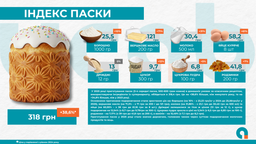 Традиційно разом із пасками українці несуть до храму освячувати яйця, ковбаси та сири, сало і овочі. Маленький великодній кошик, за підрахунками УКАБ, у 2025 році виріс в ціні на 33%, а от великий подорожчав усього на 17%.