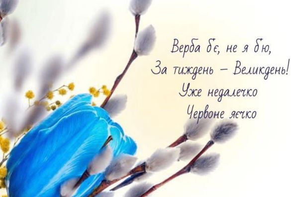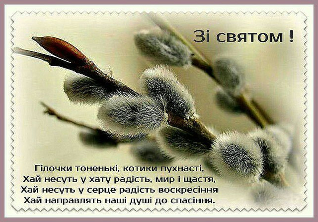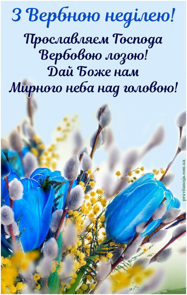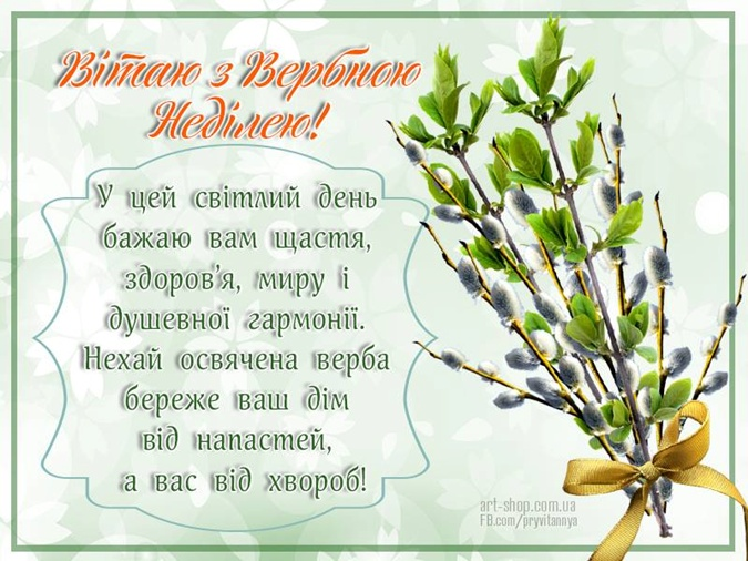 Вітаю вас з Вербною Неділею! З усього серця бажаю здоров’я всім членам вашої родини, щастя вашому дому і світлої весни! Нехай всі нещастя і прикрості обійдуть вас стороною, а радість і добро знайдуть до вас дорогу!