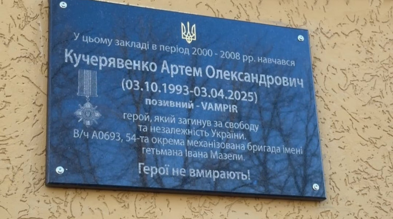 Меморіальна дошка на фасаді Харківського ліцею №93, яку відкрили у пам’ять про Артема Кучерявенка. Фото надала Анна Кучерявенко